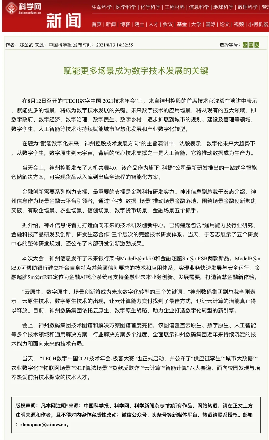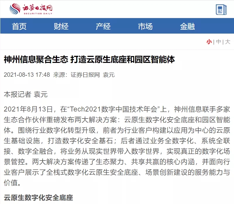 8月12日,由神州控股、BB贝博艾弗森官网、bb贝博艾弗森集团联合主办的“科技自强、数据融通、场景创新——TECH数字中国 2021技术年会”云上盛大启幕,发布神州信创云、ModelB@nk5.0、金融超脑Sm@rtFSB、云原生数字化安全底座、园区智能体等重磅产品,国内各大权威、影响力媒体多角度多频次对盛况进行报道!