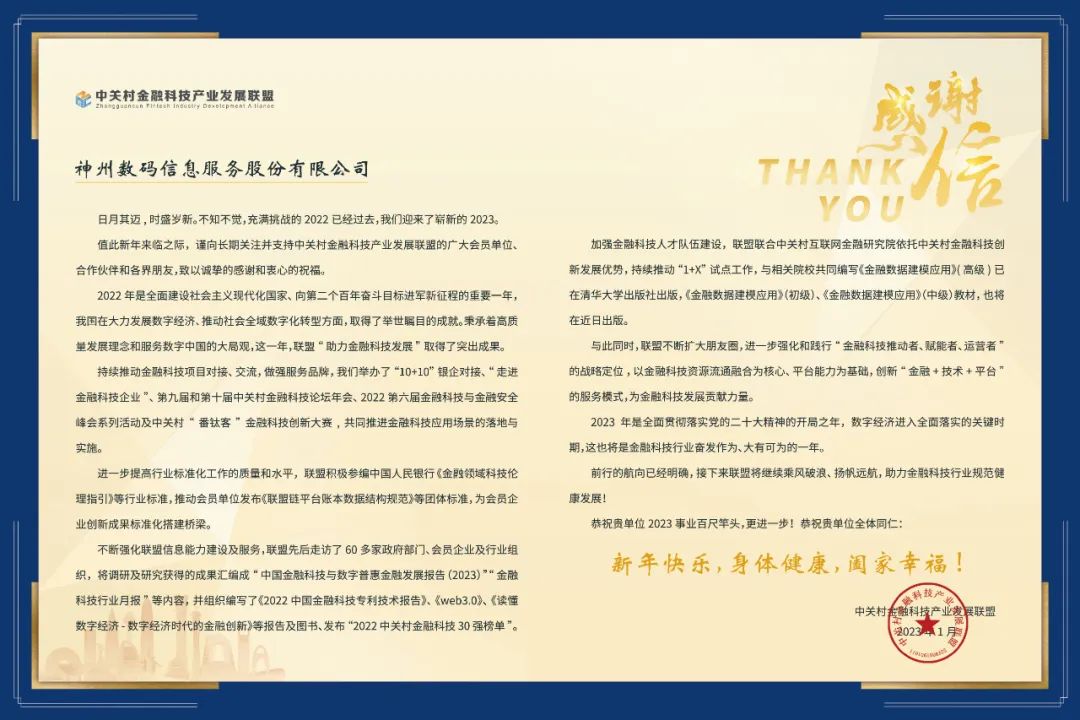 值此新年来临之际,谨向长期关注并支持中关村金融科技产业发展联盟的广大会员单位、合作伙伴和各界朋友,致诚挚的感谢和衷心的祝福。