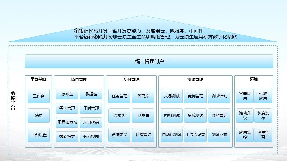 九天揽月-云原生研发效能平台:由统一管理门户、基础应用平台、项目管理平台、交付管理平台、测试管理平台和运维管理平台六大部分组成,可实现:
