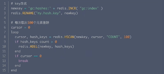 步骤:(1)key改名,相当于逻辑上删除key,任何Redis命令都访问不了该key。(2)小步多批次删除。