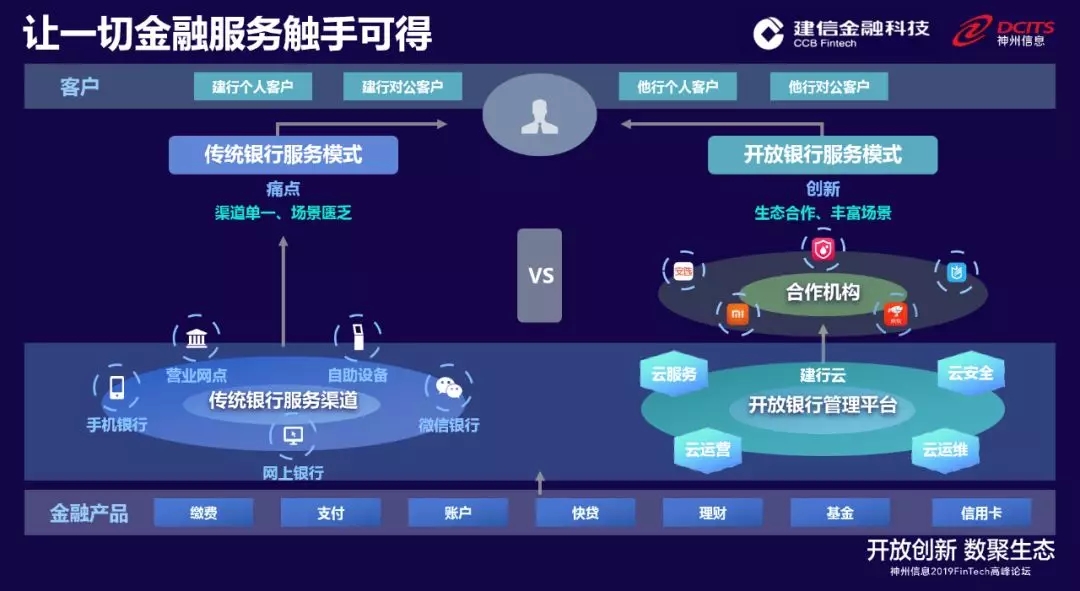 建设银行开放银行的定位,是通过提供标准化的开放模式,赋能行业合作伙伴,将金融服务延伸至外部合作平台,以客户为中心,以场景为载体,打造数字时代银行服务新连接,构建开放、合作、共享的网络金融服务。